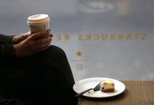 © Reuters. FILE PHOTO: A Starbucks logo hangs outside of one of the 8,000 Starbucks-owned American stores that will close…