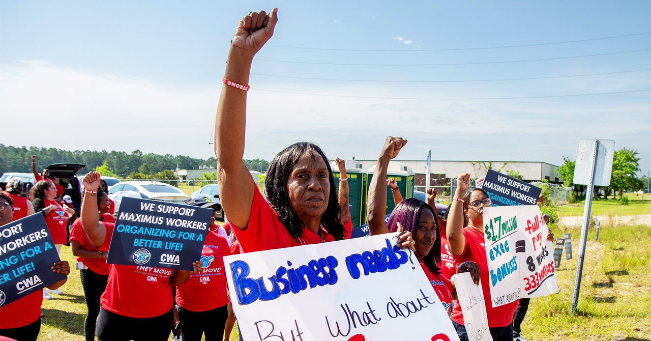 So now Charles and many of her colleagues at Maximus, the federal government’s largest call center contractor, are going on strike. Today, hundreds of Maximus workers in seven southern US states walked off the job. Among their demands are higher wages, more affordable health care plans, longer break times, and the freedom to organize a union without interference.